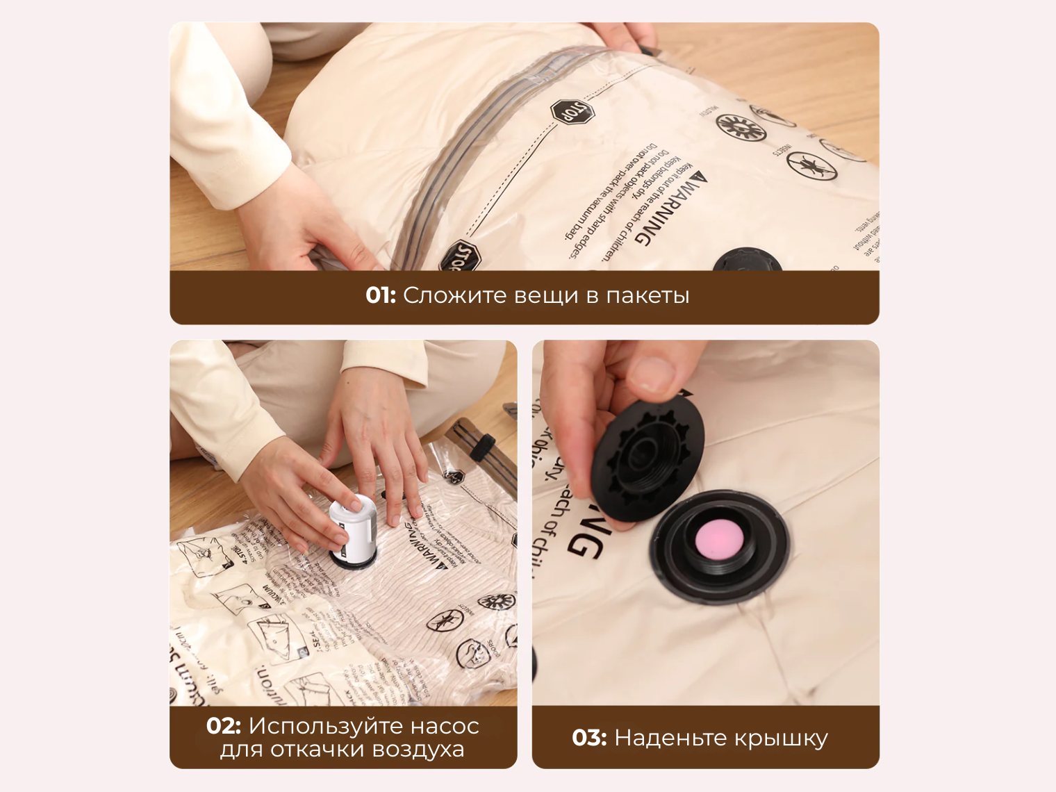 Для создания устойчивого эффекта вакуума рекомендуется использовать пакеты вместе с электрическим насосом Flextail (не входит в комплект). Этот способ быстрее ручного и позволяет уменьшить объем упакованных вещей до 80%.