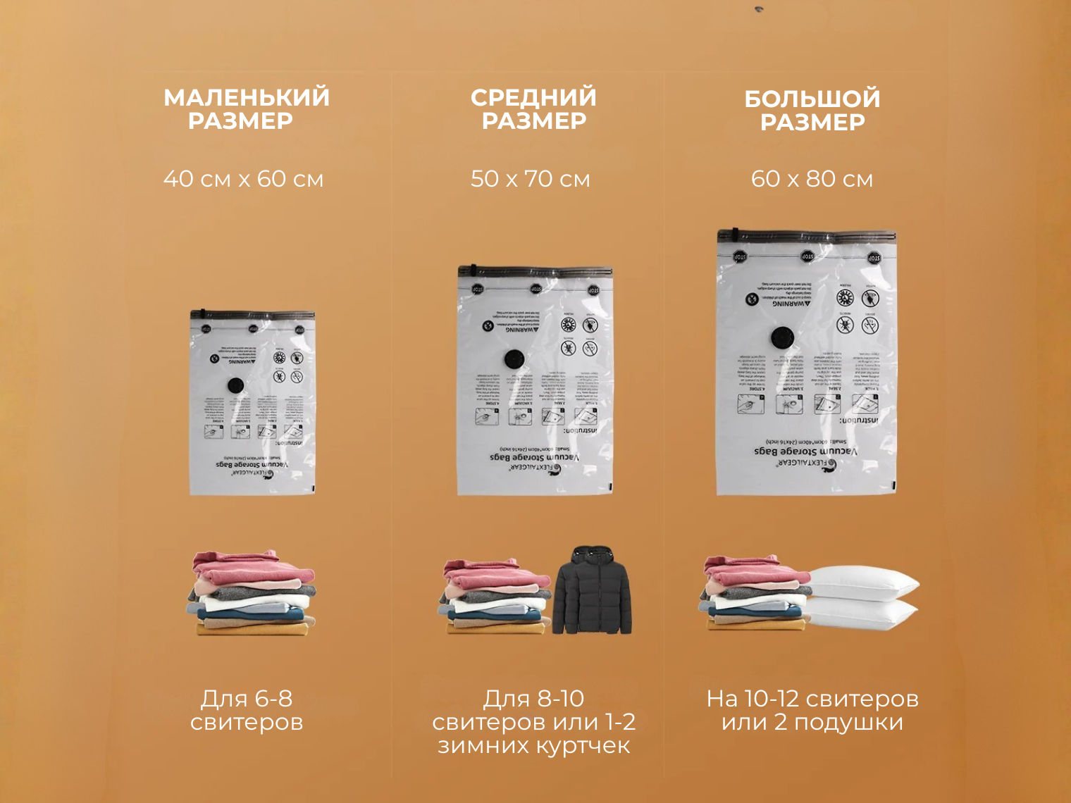 В набор входят 4 пакета размера M (50 х 70 см), которые оптимальны для хранения одежды среднего объема, пледов и комплектов белья. Ориентировочная вместимость: 8–10 свитеров или 1–2 зимних куртки.