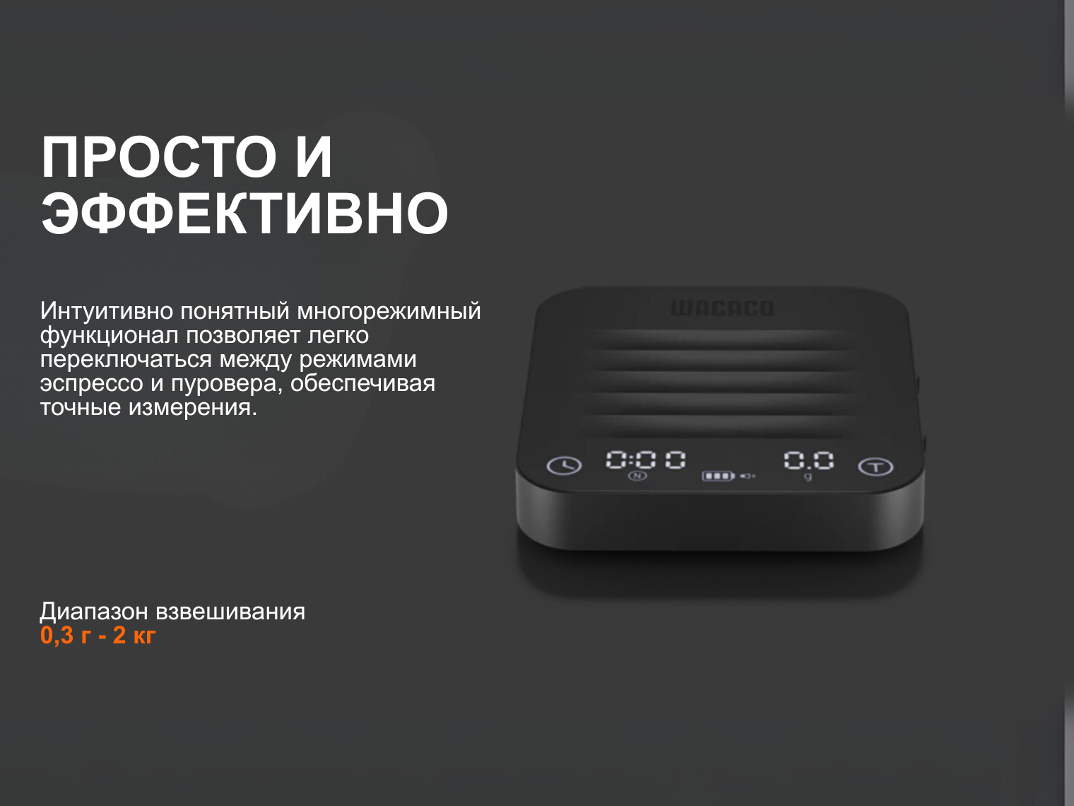 Точность измерения до 0.1 г и стабильная работа в весовом диапазоне от 0.3 г до 2 кг делают Exagram Pro универсальным помощником для каждого кофемана. Все данные отображаются на сенсорном светодиодном дисплее, который обеспечивает быструю настройку параметров в несколько нажатий.